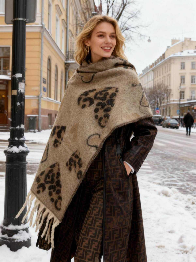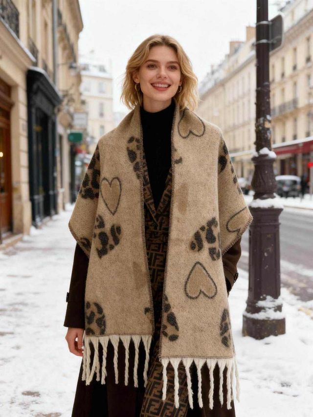 Echarpe toute douce avec franges aux motifs léopard. Disponible en beige et en noir.